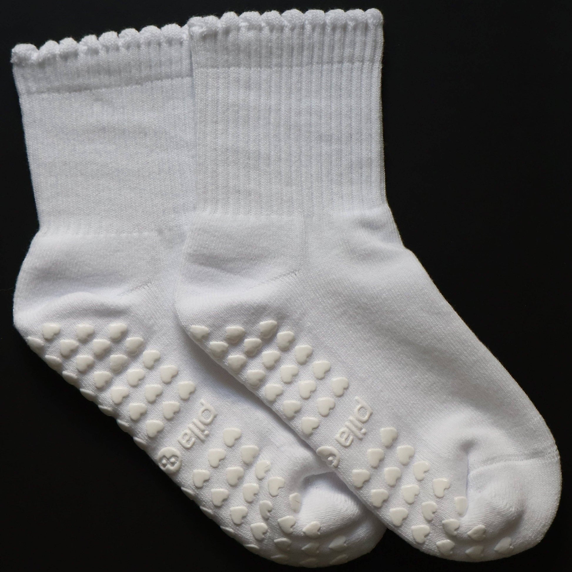 Cute Ruffle Grip Socks Soft, classic, and quietly powerful. 🤍 These cute Ruffle Grip Socks are your elevated everyday essential — designed for movement, styled with intention, and finished with a delicate ruffle detail that feels feminine yet strong. With an all-white silhouette, white heart-shaped grips, and a premium ruffled cuff that’s made to last, this pair blends studio performance with ballet-inspired charm. Timeless, versatile, and endlessly wearable — these are the socks you’ll reach for again and again. Pilabarre grip socks are one-size-fits-most (Women’s 5–11) and thoughtfully crafted for Pilates, barre, Lagree, and studio workouts, with durability you can feel from the first wear.